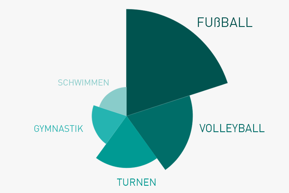 Bei den Sportarten, in denen die Vereine tätig sind, steht auf Platz 1 keine Überraschung: Hier regiert König Fußball. 35% der Vereine haben eine Fußballabteilung. Stark auf Platz 2: Volleyball mit 16% sowie weiteren 4% aus dem Bereich Beachvolleyball. Es folgen Turnen (16%), Gymnastik (13%) und Schwimmen (12%).
