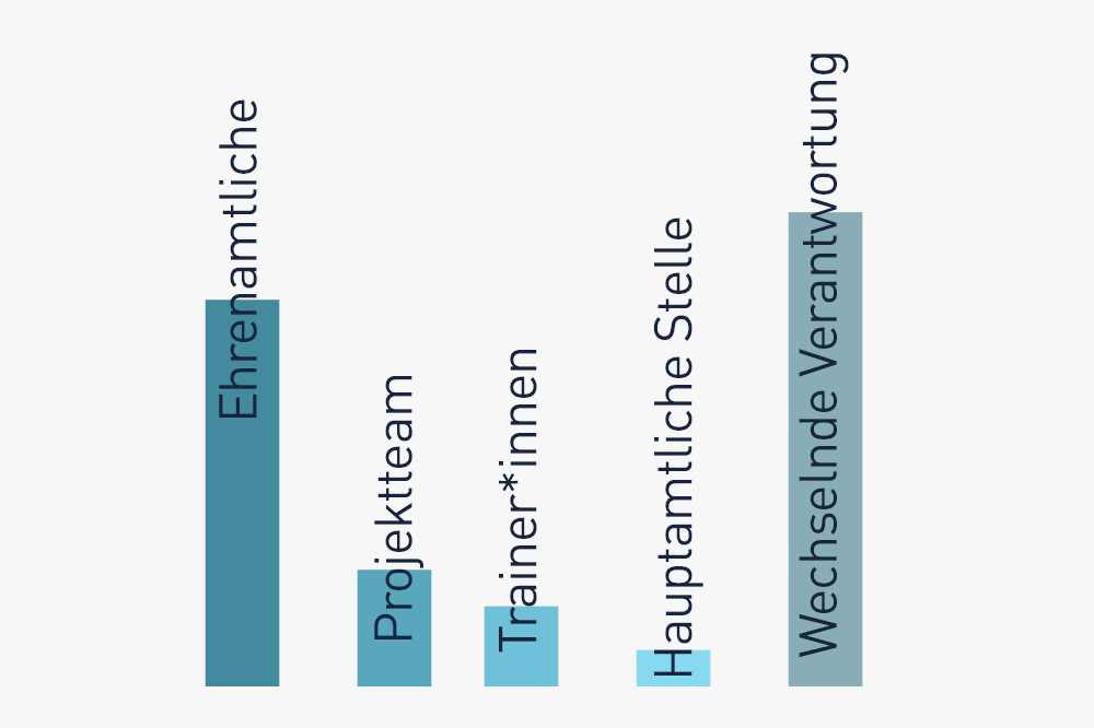 Gestemmt wird das Engagement für Nachhaltigkeit größtenteils durch Ehrenamtliche: 53% der Vereine gaben dies an. Mit einem Projektteam arbeiten 16%, fortgebildete Trainer*innen finden sich bei 11% und eine hauptamtliche Stelle können nur 5% der Vereine stellen. Dies erklärt auch, wieso 65% angaben, dass die Verantwortlichkeit je nach Angebot bzw. Projekt bei unterschiedlichen Personen liegt.