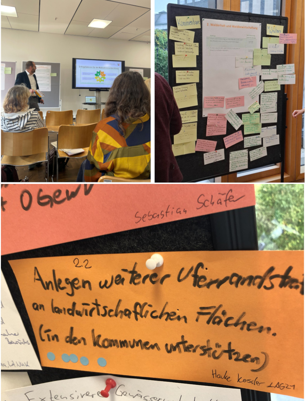 Im Workshop zu Gewässer und Auen drehten sich die Gespräche vor allem darum, wie naturnahe Gewässerstrukturen und Auen erhalten, wiederhergestellt und entwickelt, wie Störeinflüsse abgebaut und bestimmte Arten und Lebensraumtypen geschützt werden können, wie der rechtliche und finanzielle Rahmen dazu aussieht und was kollektives Bewusstsein damit zu tun hat. Als Maßnahmen vorschlagen konnten wir z.B. die Anlegung weiterer Uferrandstreifen an landwirtschaftlich genutzten Flächen (zur Minimierung des Eintrags von u.a. Nährstoffen und Pflanzenschutzmittel in die Oberflächengewässer). Zudem: Flächenankäufe zur dauerhaften Sicherung (um Strahlursprünge und Trittsteine anlegen zu können oder anderweitig zu renaturieren) sowie vereinfachte Kooperationen zum Wissenstransfer zwischen Städten, Wasser- und Naturschutzverbänden und Naturschutzbehörden zu ermöglichen. Letzteres soll vor allem vor Inaktivität bei Mischzuständigkeiten schützen.