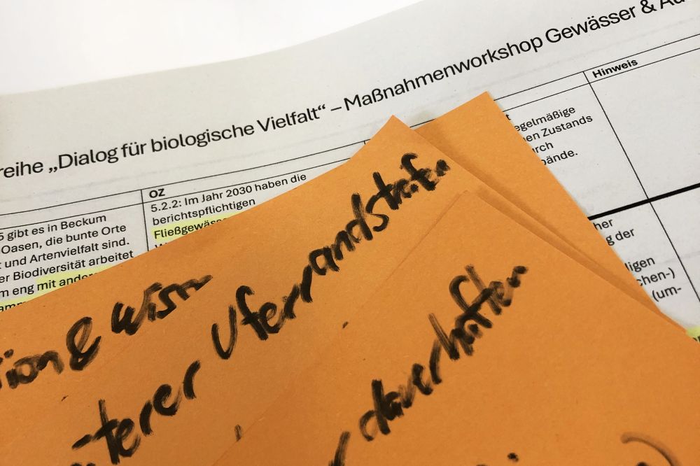 Mit dem „Dialog für biologische Vielfalt“ lud das Ministerium für Umwelt, Naturschutz und Verkehr des Landes NRW (MUNV NRW) ein, sich an diesem Weiterentwicklungsprozess zu beteiligen. Im Oktober und November 2025 fanden zur Ziel- und Maßnahmenentwicklung vier Workshops rund um die Themen Agrarlandschaft, Siedlungen & Verkehr, Gewässer & Auen sowie Wald statt.