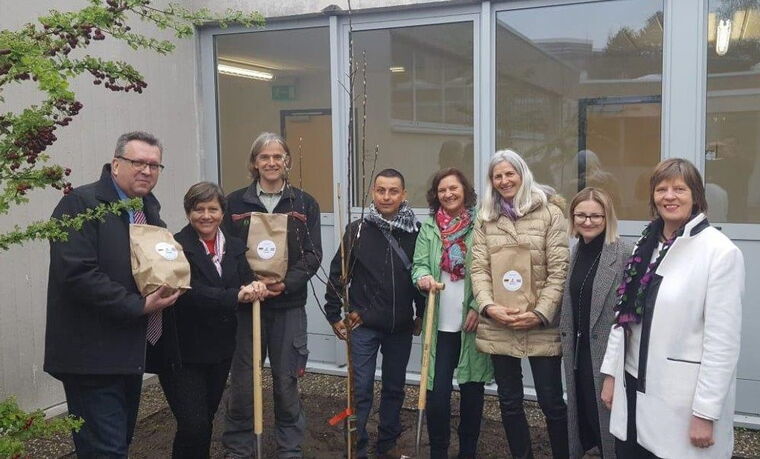 Partnerinnen und Partner pflanzten den Baum im Schulgarten ein
