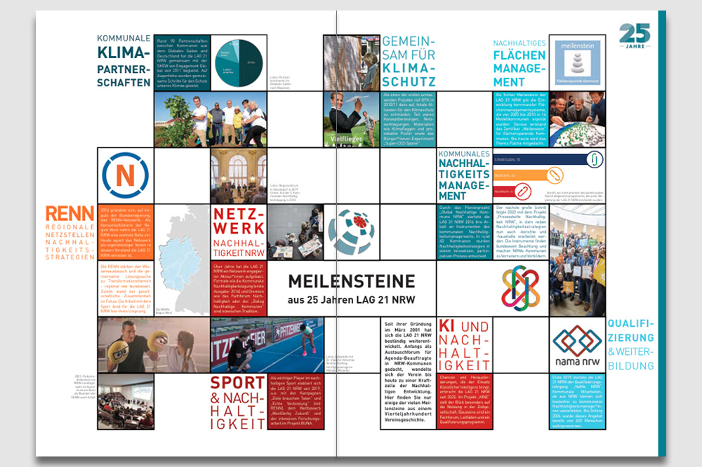 Mit dem abgelaufenen Geschäftsjahr 2025 steht nun ein Vierteljahrhundert LAG 21 NRW in den Geschichtsbüchern. Diesem Jubiläum widmen wir im aktuellen Geschäftsbericht einige Seiten, um auf Meilensteine zu schauen und Wegbegleiter*innen zu Wort kommen zu lassen. Es ist ein Querschnitt durch das vielfältige Handeln der zahlreichen Menschen, die das Netzwerk und die Geschäftsstelle der LAG 21 NRW seit ihrer Gründung mit Leben füllen.