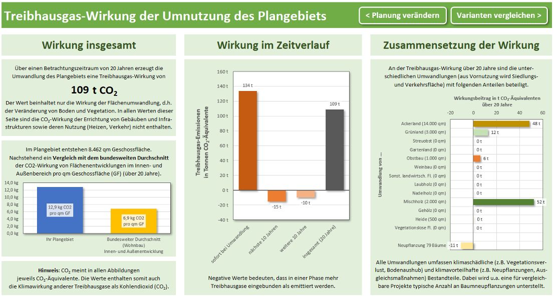 Ergänzt wird die Handlungshilfe durch einen kostenlosen LULUCF-Wirkungsrechner, der eine quantitative Abschätzung des CO2-Fußabdrucks von geplanten Flächenentwicklungen sichtbar macht und mögliche Treibhausgaseinsparungen durch Vergleiche mit alternativen Planungsoptionen ermöglicht. Hierfür wurden in dem Rechentool für alle rund 11.000 Kommunen in Deutschland standortspezifische Kennwerte, wie etwa die gemeindetypische Bebauungsdichte oder die gemeindetypische Gebäudeüberdeckung, hinterlegt.