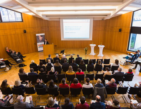 Im Anschluss beschrieb Dr. Klaus Reuter, Geschäftsführer der LAG 21 NRW, die „Ziele und Strategien für eine Nachhaltige Entwicklung – von den Sustainable Development Goals bis in die Kommunen“. „Wir haben sehr viele Erfahrungen auf den bisherigen vier Regionalforen sammeln können“, sagte Reuter. Dies sollte in Detmold nicht anders sein, wie auch die nun folgende Fishbowl-Diskussion mit Dr. Ute Röder vom Kreis Lippe, Reinold Stücke, Vorsitzender des Regionalrats und Klaus Meyer von Energie Impuls OWL e.V. zeigte.
