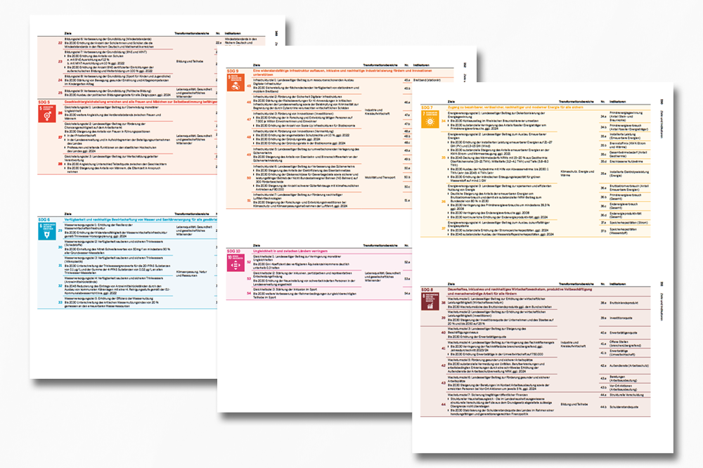 Auch „Governance“ wird als eigener Hebel benannt, u.a. mit folgendem Anspruch: „Die Landesregierung verankert transparente und nachprüfbare Prozesse und Vorgaben, um Regierungs- und Verwaltungshandeln anhand von Nachhaltigkeitskriterien auszurichten“ (S.122). Eingegangen wird auch auf die Good-Governance-Kriterien des Europäischen Nachhaltigkeitsnetzwerks European Sustainable Development Network (ESDN).