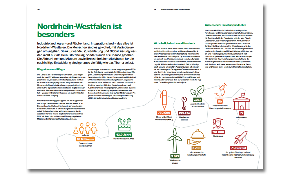 Auf den ersten Blick besticht die neue Strategie mit dem Titel „Leben in Nordrhein-Westfalen“ durch eine kommunikative Darstellungsform, die die Lesefreundlichkeit erhöht und durch zahlreiche Abbildungen Informationen kompakt bündelt. Strukturiert ist das Dokument übersichtlich in vier Hauptteile. Unter „Gemeinsam“ finden sich sechs Zukunftsbilder sowie Details zu wichtigen Themen und Strukturen der Nachhaltigkeit in NRW. Der Abschnitt „Nachhaltig Handeln“ sammelt die sechs neu benannten Transformationsbereiche und sieben Hebel der Strategie. Unter „Heute und in Zukunft“ finden sich Infos zu Steuerung und Monitoring und im Anhang das Ziel- und Indikatorensystem.