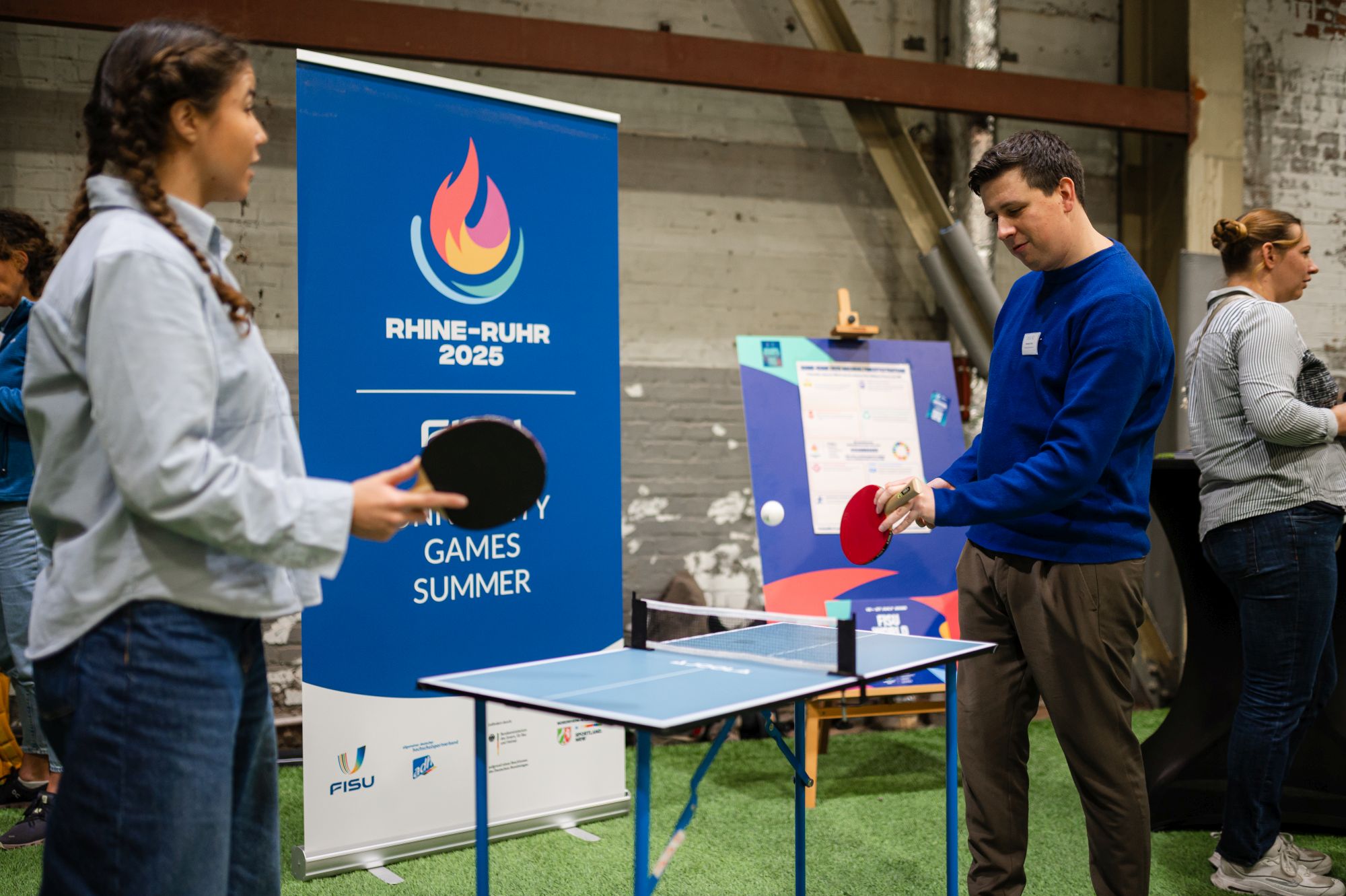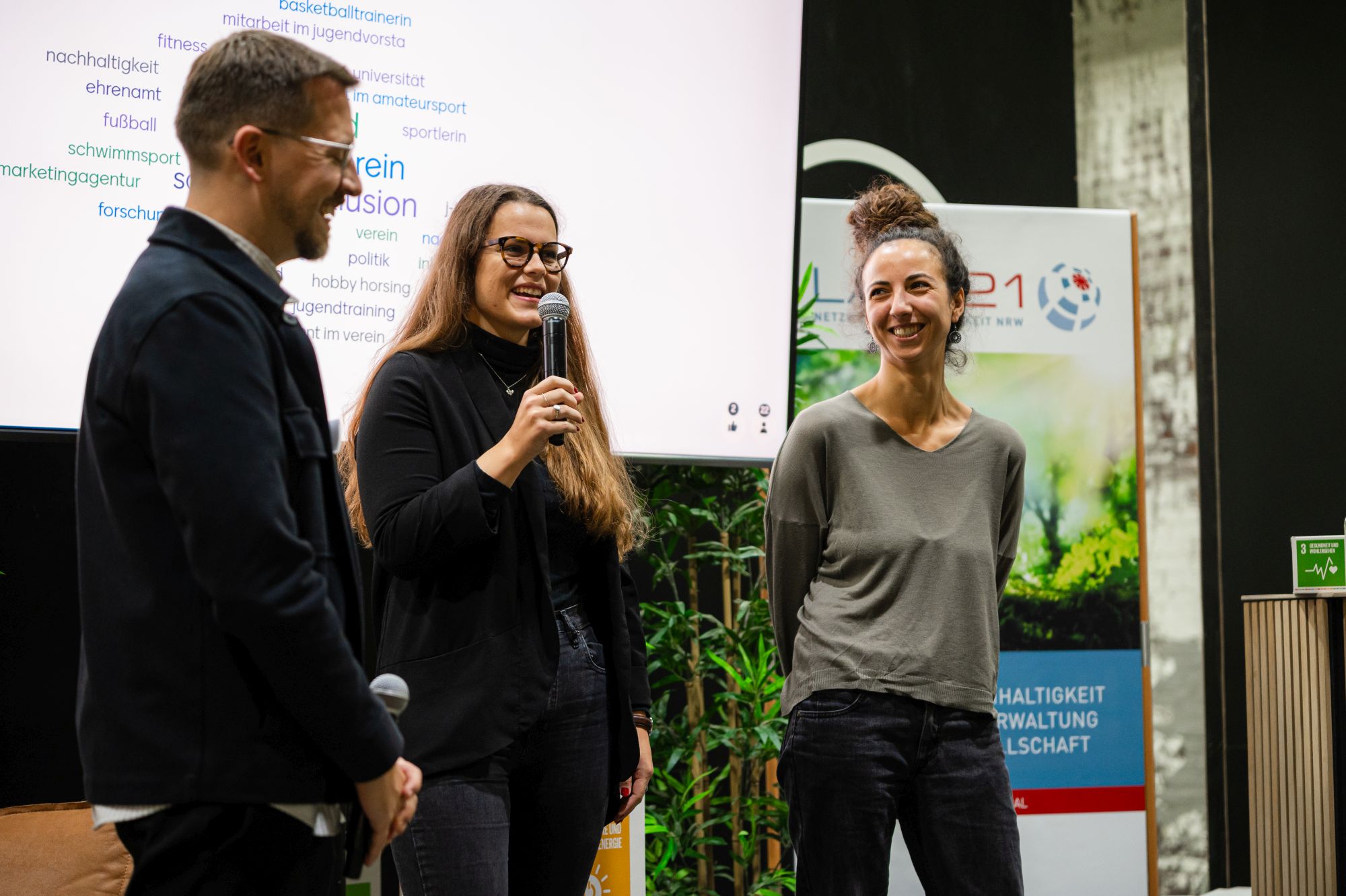 Hinter der Schattenwand verbargen sich übrigens Svea Loer vom Schwimmverband NRW aus dem Jugendausschuss Nachhaltigkeit und Helen Gampper von der FISU Rhine-Ruhr 2025, die anschließend auch in einer Diskussionsrunde mit dem Publikum in den Austausch gingen. Besprochen wurde unter anderem, wie die Lücke zwischen Befürworter*innen und Gegner*innen einer sozial-ökologischen Transformation überbrückt werden kann oder wie Organisationen zielgerichtet vom Wissen ins Handeln kommen können.
