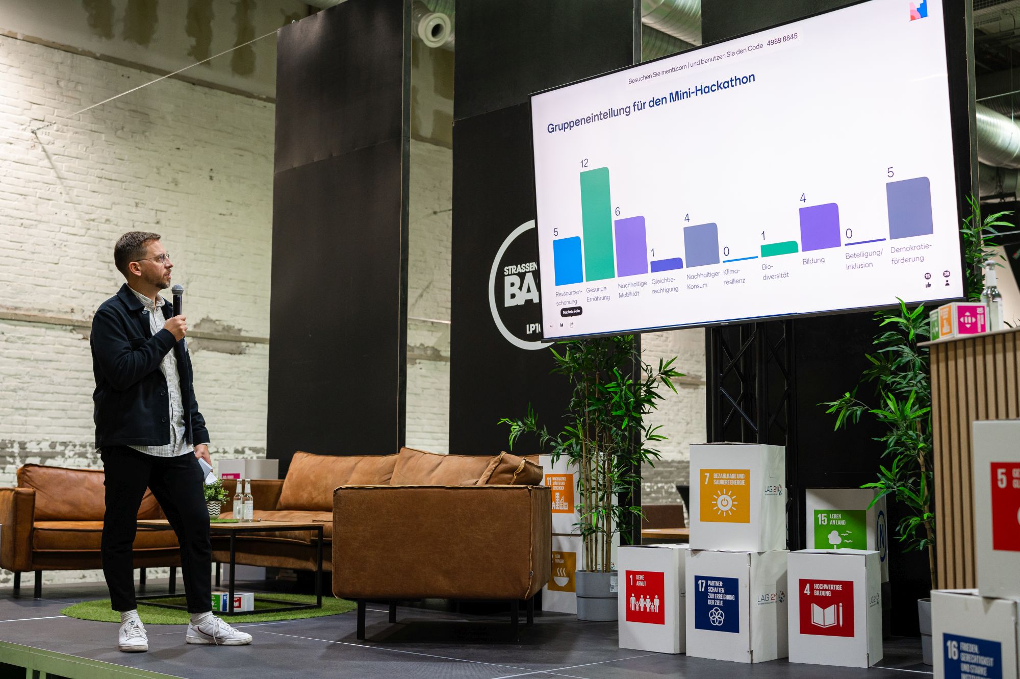 Anschließend startete mit dem Mini-Hackathon der interaktive Part der Konferenz. Aus zehn Nachhaltigkeitsherausforderungen für den Sport konnte das Publikum per Abstimmung vier zur weiteren Bearbeitung auswählen. Vier Gruppen arbeiteten dann gemeinsam an innovativen Ideen zu den Themen: