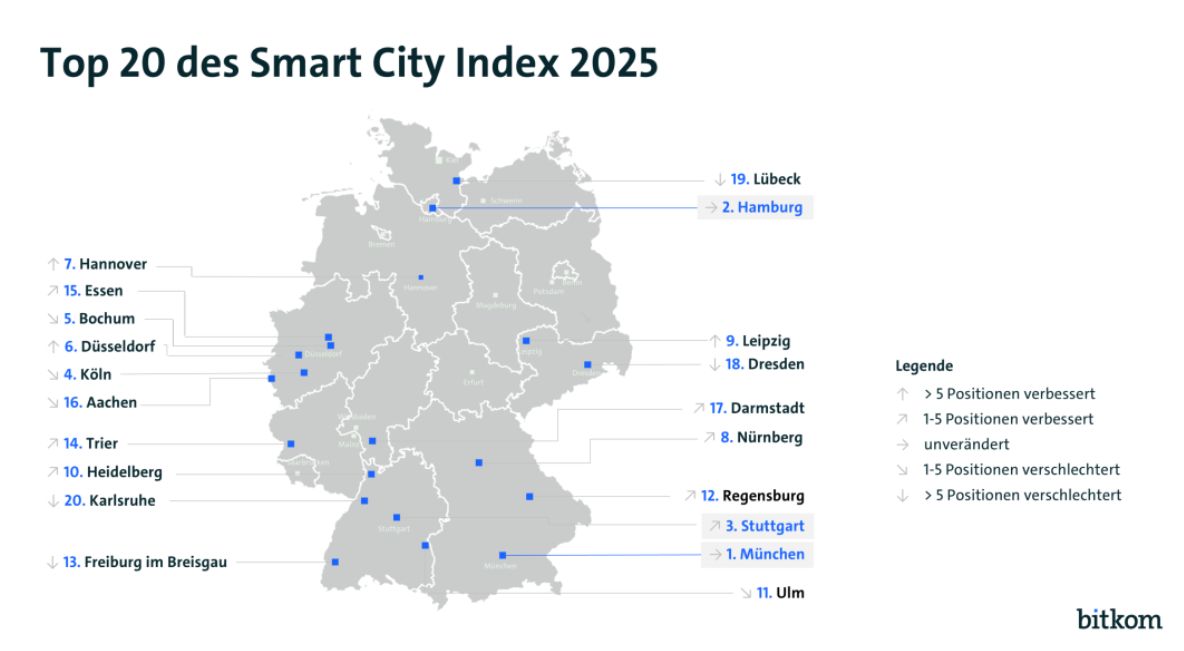 Wie gut deutsche Großstädte (ab 100.000 Einwohner*innen) diesen Ansprüchen gerecht werden, zeigt der Smart City Index des Think Tanks Bitkom seit 2019. Erfasst wurden 2025 ganze 13.529 Datenpunkte in fünf relevanten Themenbereichen. Indikatoren, die betrachtet wurden, sind u.a. Online-Bürger-Services, Sharing-Angebote oder intelligente Ampeln.