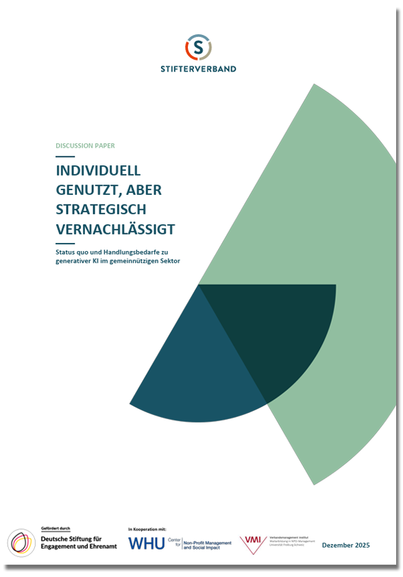 Mal eben schnell die KI fragen – das ist bereits gelebter Alltag für einen Großteil der Engagierten und Beschäftigten im gemeinnützigen Sektor. Doch Richtlinien zur Nutzung oder Aufbau von Kompetenzen fehlt in den meisten Organisationen. Diese Erkenntnis lieferte im Dezember 2025 eine Studie, die in Kooperation von Zivilgesellschaft in Zahlen (ZiviZ im Stifterverband), der WHU – Otto Beisheim School of Management und dem Institut für Verbands-, Stiftungs- und Genossenschaftsmanagement (VMI) und durch Förderung der Deutschen Stiftung für Engagement und Ehrenamt entstand. >> Download