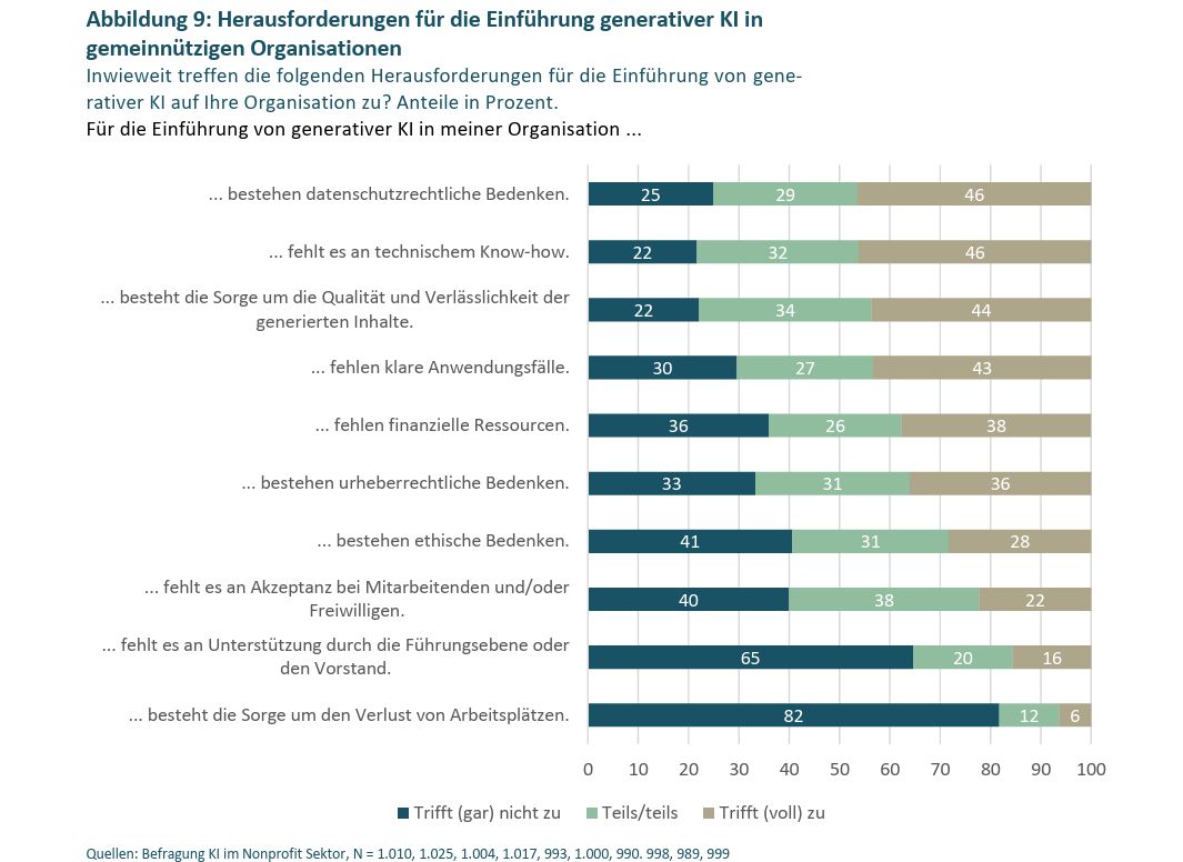 Unsere Studie zeigt, dass die Nutzung von KI im gemeinnützigen Sektor weit verbreitet ist. Fast drei Viertel der Engagierten und Beschäftigten nutzen KI-Tools im Rahmen ihrer gemeinnützigen Tätigkeit. Gleichzeitig stellen wir fest, dass der Einsatz von KI-Tools meist den Einzelnen überlassen bleibt. Nur 12 Prozent der Organisationen haben zentrale Initiativen zum Einsatz von KI entwickelt und nur 9 Prozent verfügen über verbindliche Richtlinien. Die Technologie ist also in der Breite der Zivilgesellschaft angekommen, es fehlt aber oft noch an einer strategischen Steuerung und klaren Leitplanken. Hier ist die Führungsebene gefragt, mehr Initiative zu zeigen. Denn KI ist keine rein operative Frage der Nutzung einzelner Tools, sondern berührt Grundfragen der Organisationsentwicklung sowie der Organisationskultur.