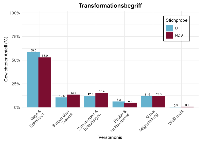 Mit Blick auf das Begriffsverständnis der deutschen Bevölkerung zeigt sich zunächst, dass „Transformation“ für einen Großteil (58,6%) in erster Linie eine vage oder unkonkrete Begrifflichkeit darstellt. Hier zeigt sich aus Sicht der Autor*innen der Studie bereits ein zentrales Problem: Die Mehrheit der Bevölkerung hat keine Vorstellung davon, was Transformation bedeuten soll. Unter Heranziehung aktueller Forschung empfehlen sie, eine Konkretisierung des Begriffs durch Wissenschaft, Medien und Politik, insbesondere mit ehrlichem Fokus auf vorhandene Herausforderungen und Beteiligungsmöglichkeiten.
