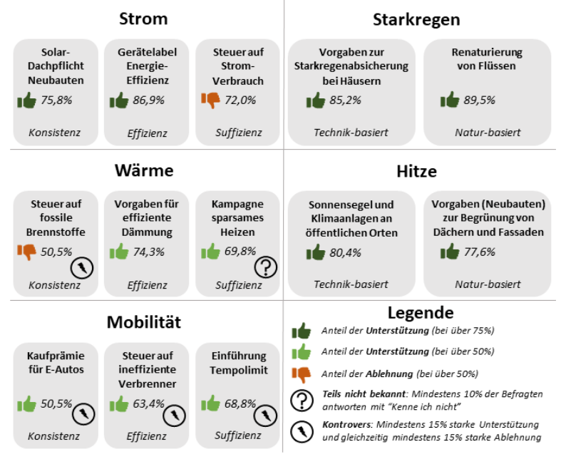 Obwohl offensichtliche Differenzen in der gewünschten Geschwindigkeit und Richtung der Transformation existieren, finden sich klare Mehrheiten für verschiedene Politikinstrumente, wie die Renaturierung von Flüssen (89,5%), eine Solar-Dachpflicht für Neubauten (75,8%) oder die Einführung eines Tempolimits (68,8%). Starke oder grundsätzliche Zustimmung gibt es auch für die Nutzung weiterer, grundlegender Strategien für den Klimaschutz, wie die Fokussierung auf Grundbedürfnisse (94,2 %), Regeneration (84%) oder globale Umverteilung (74,5%).