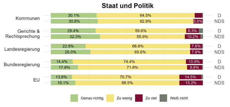 Das aktuelle Engagement staatlicher Akteure für eine nachhaltige Transformation fällt jedoch insgesamt nicht gut aus. Nur 14,4% sind der Meinung, dass die Bundesregierung sich genug für Nachhaltigkeit engagiere – nur bei der EU (13,8%) ist die deutsche Bevölkerung der Meinung, dass sie sich noch weniger engagiert als sie aus Sicht der Befragten müsste. Am positivsten werden Kommunen bewertet: rund 30% der Befragten sind der Meinung, das Engagement von Kommunen sei „genau richtig“. Geringe Zufriedenheitswerte erzielen auch wirtschaftliche Akteure, während zivilgesellschaftliches Handeln positiver bewertet wird.