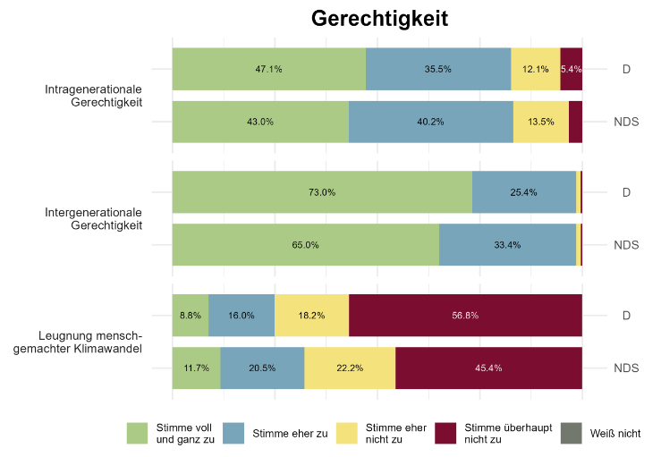 Besonders ermutigend: Die Ergebnisse zeigen, dass es eine starke Zustimmung zur grundsätzlichen Stoßrichtung nachhaltiger Transformation gibt. Eine deutliche Mehrheit (82,6%) stimmt zu, „dass wir dafür sorgen müssen, dass alle Menschen weltweit ihre grundlegenden Bedürfnisse befriedigen können“. Die damit verbundenen Gerechtigkeitsansprüche sind stark intragenerationaler und noch stärker intergenerationaler Natur.