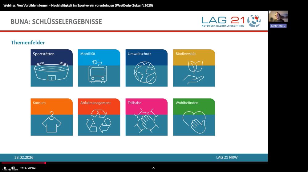 Sportvereine können starke Beiträge für die Nachhaltige Entwicklung im Land leisten. Vier starke Beispiele dafür, wie Vereine sich für ökologische, soziale und wirtschaftliche Nachhaltigkeit engagieren, präsentierten sich in unserem Webinar „Von Vorbildern lernen - Nachhaltigkeit im Sportverein voranbringen“ am 23. Februar 2026.