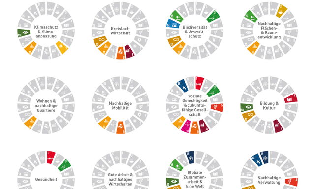 Handlungsfelder einer Nachhaltigkeitsstrategie: Aus diesen zwölf Handlungsfeldern wählen Kommunen die zentralen Themen für ihre Nachhaltigkeitsstrategie aus: